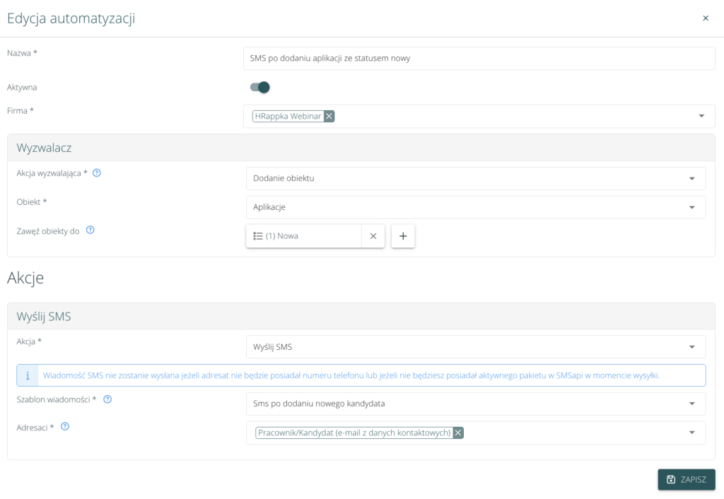 Przykładowo aby zdefiniować automatyzację wysyłki SMS do osób, u których w systemie pojawiła się nowa aplikacja (aplikowały przez formularz aplikacyjny, lub w systemie dodano im aplikację), konfiguracja powinna wyglądać następująco: