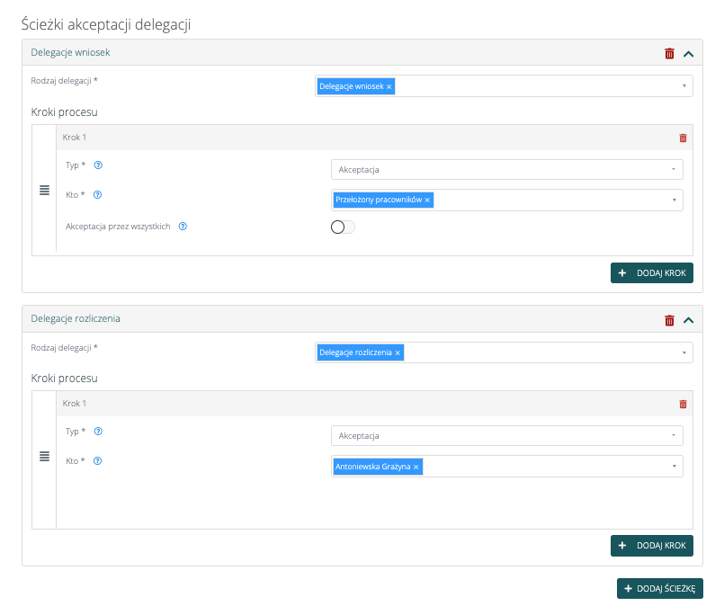 - konfigurację ścieżek akceptacji wniosków o delegację oraz rozliczeń delegacji