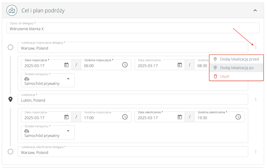 - Jeżeli cel ma wiele lokalizacji pośrednich, można je dodać korzystając z opcji dostępnych pod ikoną trzech kropek: