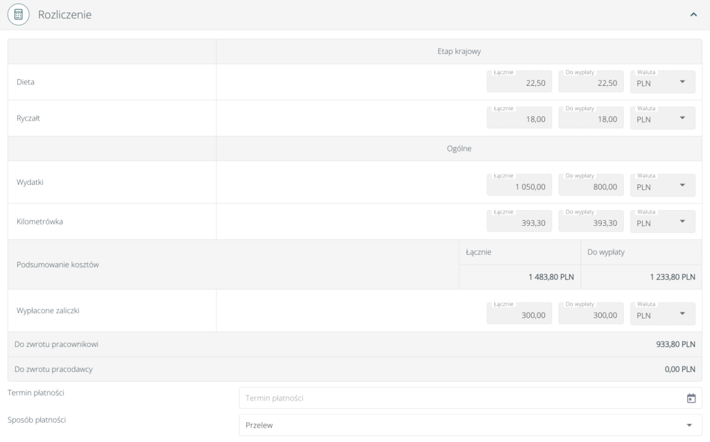 Co więcej, poniżej sekcji uzupełnionych przez wnioskującego pojawi się sekcja Rozliczenie: