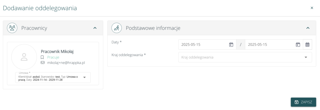 Dodając oddelegowanie należy uzupełnić daty oddelegowanie oraz kraj delegowania, a system odpowiednio naliczy wynagrodzenie pod kątem składkowo – podatkowym.