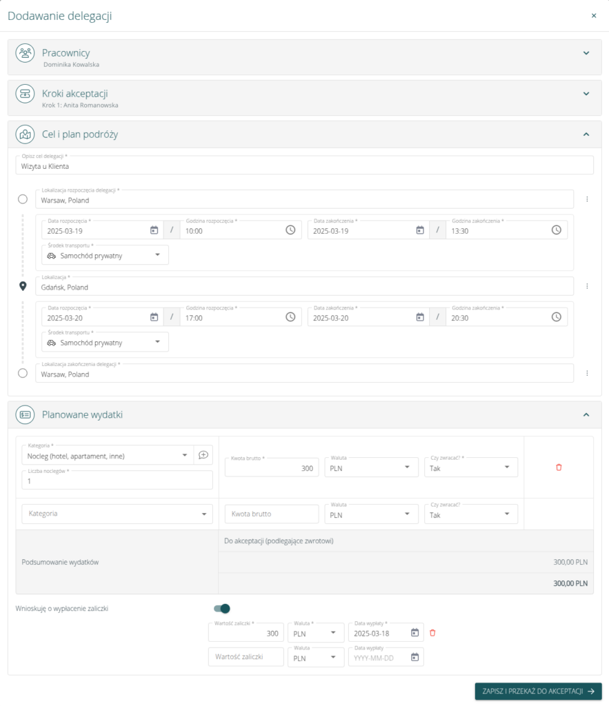 Po kliknięciu Zapisz i przejdź do akceptacji wniosek zostanie zapisany i wysłany do akceptacji przez osobę zdefiniowaną w ścieżce akceptacji wniosków o delegację o rodzaju „Delegacja wniosek”.