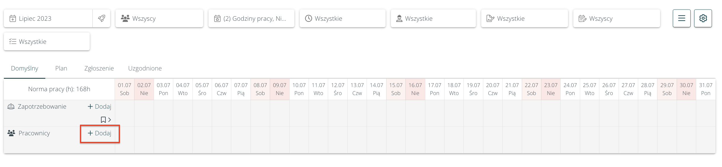 Jeżeli na kalendarzu pracy (CRM > Klienci > Dany Klient > Kalendarz pracy oraz Pracownicy > Działy > Dany dział > Kalendarz pracy) nie widzisz pracowników, możesz dodać ich klikając w ikonę „plusa":