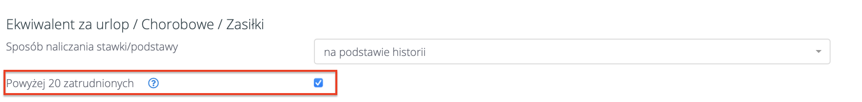 Jeżeli w Ustawienia > Moduły > Pracownicy, w sekcji „Ekwiwalent urlopowy / Chorobowe / Zasiłki” jest włączona opcja „Powyżej 20 zatrudnionych” zasiłek chorobowy dla umów o pracę naliczy się.
