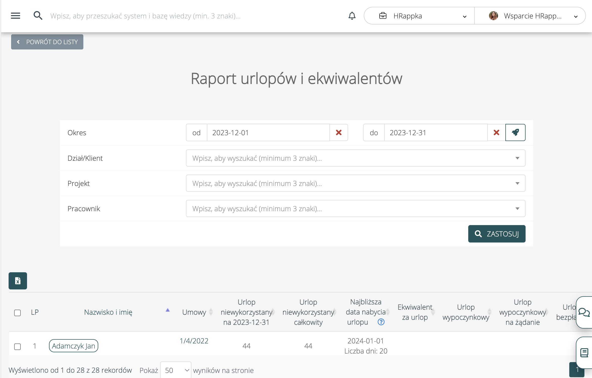 Raport wykorzystanych urlopów pracownika można znaleźć w Raporty > Raport urlopów i ekwiwalentów.