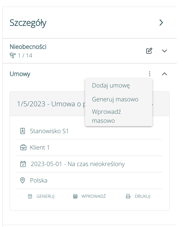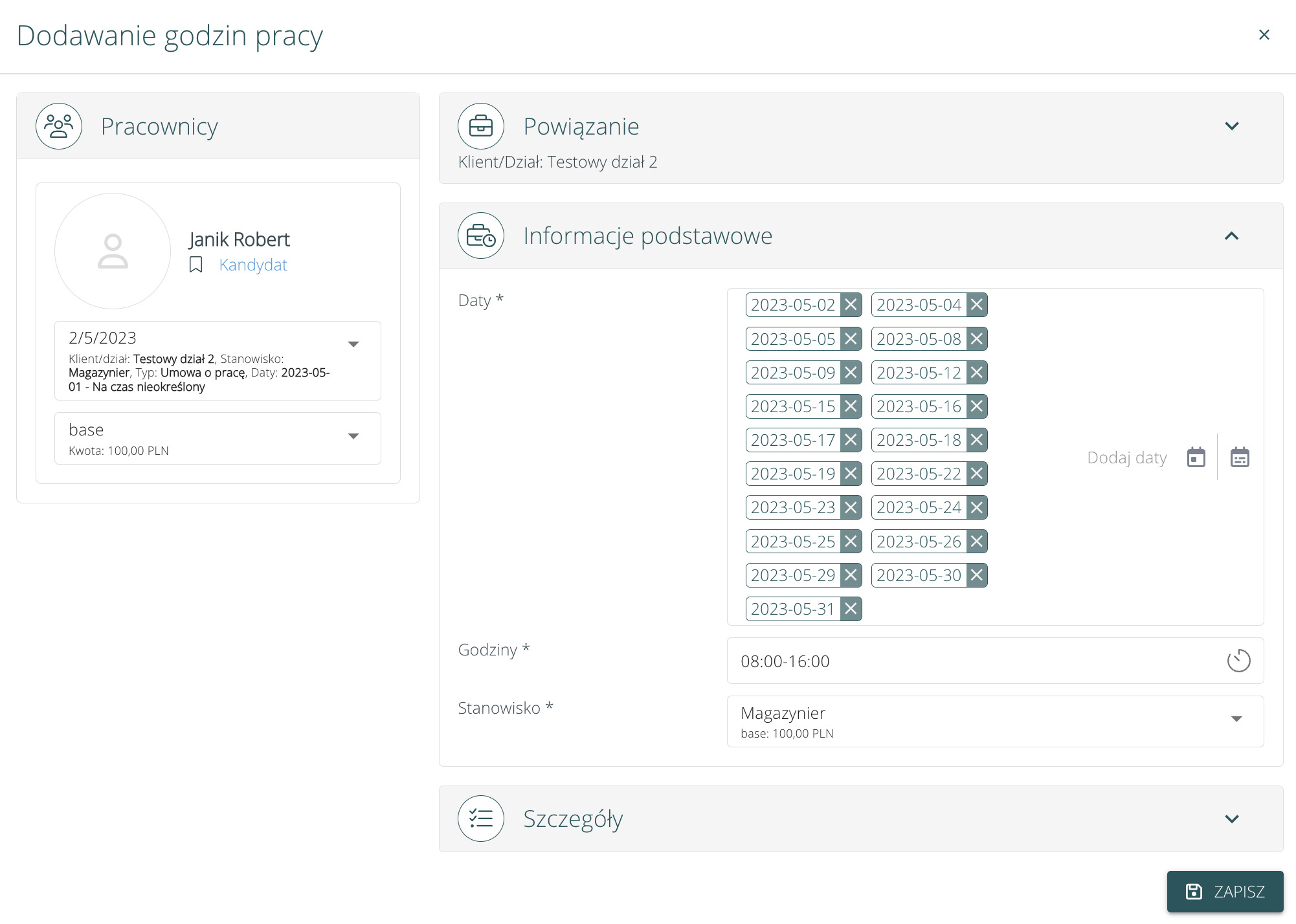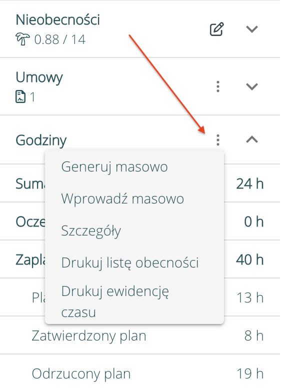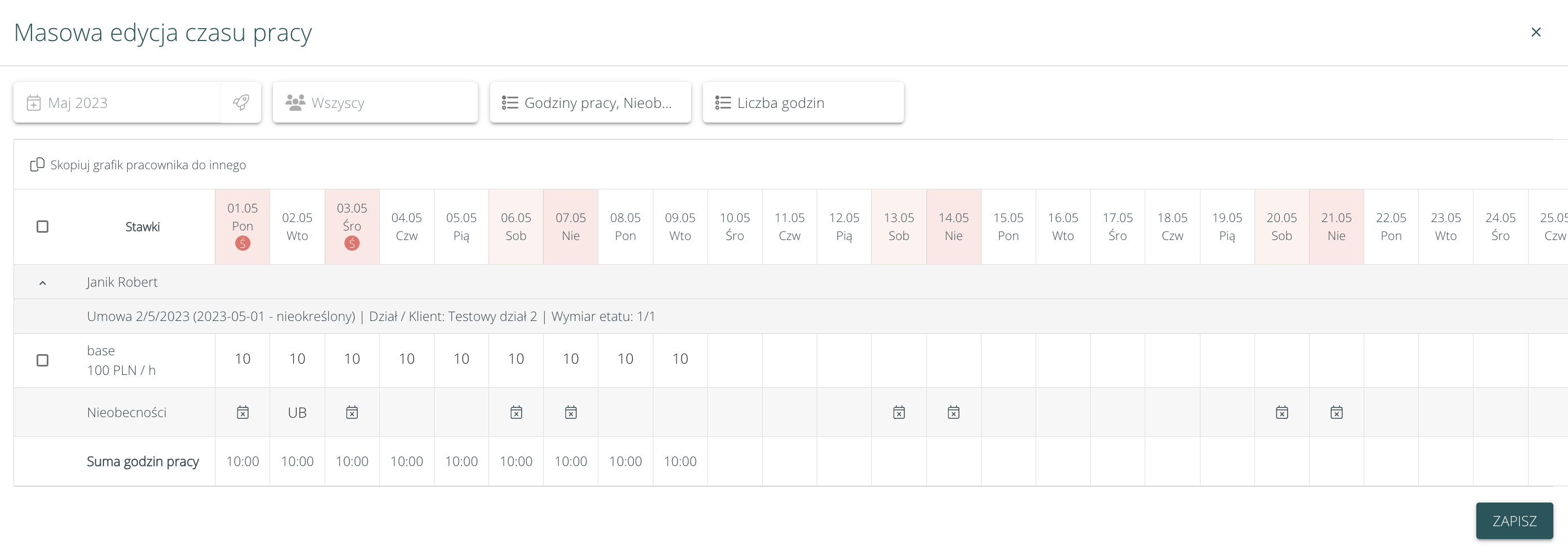Grafik tworzymy w celu sporządzenia dla każdego zatrudnionego pracownika harmonogramu czasu pracy na dany okres rozliczeniowy. Jeżeli chcesz tworzyć zapotrzebowanie na wybrane stanowiska i godziny pracy i planować pracowników zgodnie z zapotrzebowaniem, skorzystaj z kalendarza pracy. Jeżeli chcesz pracować na grafiku pracownika jedynie w kontekście jego grafiku, skorzystaj z grafiku pracownika dostępnego na profilu pracownika w sekcji Grafik. Na grafiku pracownika są widoczne wpisy grafikowe dodane pracownikowi na kalendarzu pracy. Uzupełnione wpisy grafikowe zostaną przeniesione na siatkę godzin rozliczenia, w celu wykonania wynagrodzenia pracownikowi za przepracowane godziny pracy. Jeżeli pracownik nie ma dodanej w systemie umowy, to możemy mu jedynie dodać plan pracy, a nie godziny pracy. Plan pracy dodasz pracownikowi na kalendarzu pracy lub na grafiku pracownika, po zmianie widoku w filtrach na „Planowanie": Jak dodać umowę dowiesz się tutaj. W celu wypełnienia godzin czasu pracy należy wejść w moduł Pracownicy. Następnie wybieramy pracownika, dla którego chcemy wypełnić grafik oraz wybieramy zakładkę Grafik. Wpisy możemy dodawać na pojedyncze dni lub na wiele dni masowo. W zależności od tego jak pracują pracownicy (czy w tych samych godzinach i generujemy grafik masowo, czy dodajemy pojedyncze wpisy, czy chcemy dodać różne wpisy na cały miesiąc) sugerujemy z korzystania z innych sposobów dodawania wpisów. Pierwszym sposobem jest kliknięcie na dzień lub zaznaczenie kursorem kilku dni, na które chcemy dodać wpis grafikowy. Do wyboru pojawią się opcje wpisów jakie możemy dodać pracownikowi: godziny pracy, nieobecność, wynagrodzenie, premię, nocleg, transport, dzień wolny, niedostępność. Aby dodać godziny pracy należy wybrać “Godziny pracy”: Pojawi się okno, w którym dodamy godziny pracy: W grafiku pracownika znajdującym się na profilu pracownika w sekcji „Grafik", poza nowym komponentem kalendarza, wprowadziliśmy zmiany w prawym panelu, zawierającym informacje o nieobecnościach, umowach, czy godzinach pracy. Zwinięta sekcja nieobecności informuje o ilości dostępnego i całkowitego urlopu. Rozwinięcie sekcji informuje o szczegółach urlopu wypoczynkowego, urlopu na żądanie, chorobowego oraz własnych rodzajów nieobecności zdefiniowanych w ustawieniach. Kliknięcie na ikonę umożliwia wyświetlenie ustawień i szczegółów nieobecności oraz umożliwia dodanie korekty i dodatkowych limitów nieobecności. W zakładce „Szczegóły pracy limitowanej” dostępnej po kliknięciu ikony „” przy podsumowaniu pracy limitowanej na grafiku pracownika dostępne są informacje o wykorzystaniu limitu pracy zdalnej: Sekcja Umowy, znajdująca się w panelu po prawej stronie na grafiku pracownika zawiera informacje o umowach pracownika. Z tego poziomu, klikając na ikonę możemy dodać nową umowę pracownikowi oraz masowo wprowadzić godziny pracy. Sekcja Godziny pracy, znajdująca się w panelu po prawej stronie na grafiku pracownika została przebudowana: Zwinięty panel pokazuje podsumowanie godzin: Po rozwinięciu sekcji, pojawią się szczegółowe informacje: Jak widać, do sekcji z godzinami pracy przeniesione zostały dane z sekcji „Oczekiwany czas pracy„. Po najechaniu na ikonę przy „Oczekiwane" można dodać oczekiwany przez pracownika czas pracy. Akcje dotyczące umów zostały przeniesione pod ikonę : Ta opcja najlepiej sprawdzi się, gdy chcemy wygenerować grafik pracownikowi, który pracuje codziennie w tych samych godzinach. Aby wygenerować wpisy grafikowe, należy kliknąć w przycisk “Generuj” znajdujący po prawej stronie w sekcji umów/godzin pracy (lub „Generuj masowo" jeżeli chcemy masowo wygenerować wpisy). Po kliknięciu, automatycznie pojawia się okno z uzupełnionymi datami, które są dostosowane do typu umowy, stawek oraz wymiaru zatrudnienia. Możemy dostosować wpisy do konkretnej stawki jaka znajduje się w umowie. Jeśli wygenerowane przez system wpisy nam odpowiadają, należy kliknąć przycisk “Zapisz”. Jeśli natomiast chcemy wprowadzić zmiany, możemy modyfikować godziny oraz dni pracy: Trzecim sposobem jest przycisk “Wprowadź” znajdujący się obok “Generuj”. Ta opcja sprawdzi się najlepiej gdy pracownicy pracują w różnych godzinach pracy. Poprzez „Wprowadź" w szybki sposób uzupełnimy godziny pracy na cały miesiąc. Po kliknięciu pojawi się okienko, w którym możemy dodać godziny pracy przypisane do stawek znajdujących się na umowie pracownika. Możemy wpisywać godziny pracy i sprawnie przeciągać wartość je na inne dni oraz przeskakiwać do następnych komórek korzystając z przycisku Tab. Akcje masowe dostępne są nad tabelą i umożliwiają uzupełnianie grafiku normą oraz wyczyszczenie godzin pracy. Opcje wyświetlania dodatkowych elementów listy dostępne są w filtrach nad tabelą. Możemy wybrać, czy wyświetlać wiersz nieobecności czy godzin pracy oraz czy pokazywać jedynie wiersz ilość godzin pracy czy ilości godzin pracy i godziny pracy (od-do). Wskazówki: