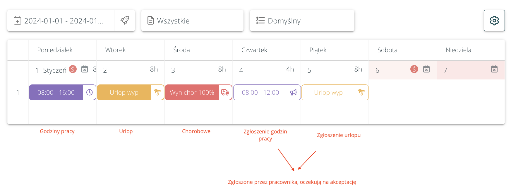 Zawiera ilość godzin zgłoszonych przez pracownika z podziałem na godziny pracy i nieobecności