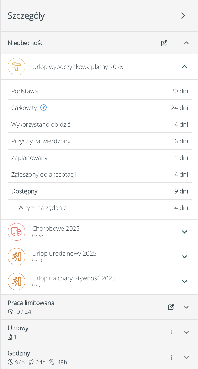Zawiera oczekiwany wymiar czasu pracy przez pracownika w wybranym okresie, wprowadzony po kliknięciu ikony dostępnej po rozwinięciu sekcji Godzin