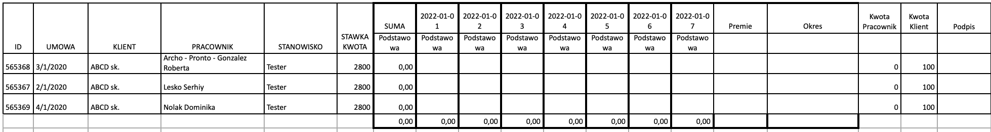 Pobrany plik będzie miał już uzupełnione podstawowe informacje widoczne na 1 kroku rozliczenia (m.in. numer umowy, Klient, pracownik, stanowisko, stawka). W kolumnach / wierszach dat należy wpisać odpowiednią ilość (lub zakres) godzin: