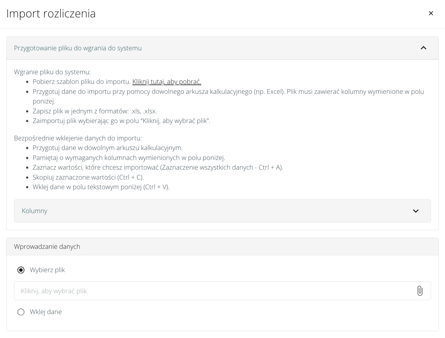 Następnie pojawi się okno, które umożliwia pobranie szablonu pliku do uzupełnienia i zaimportowania do systemu: