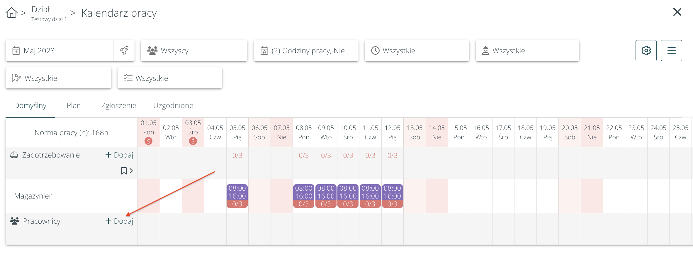 Pracowników możemy również dodać klikając w „+ Dodaj" w wierszu pracownika: