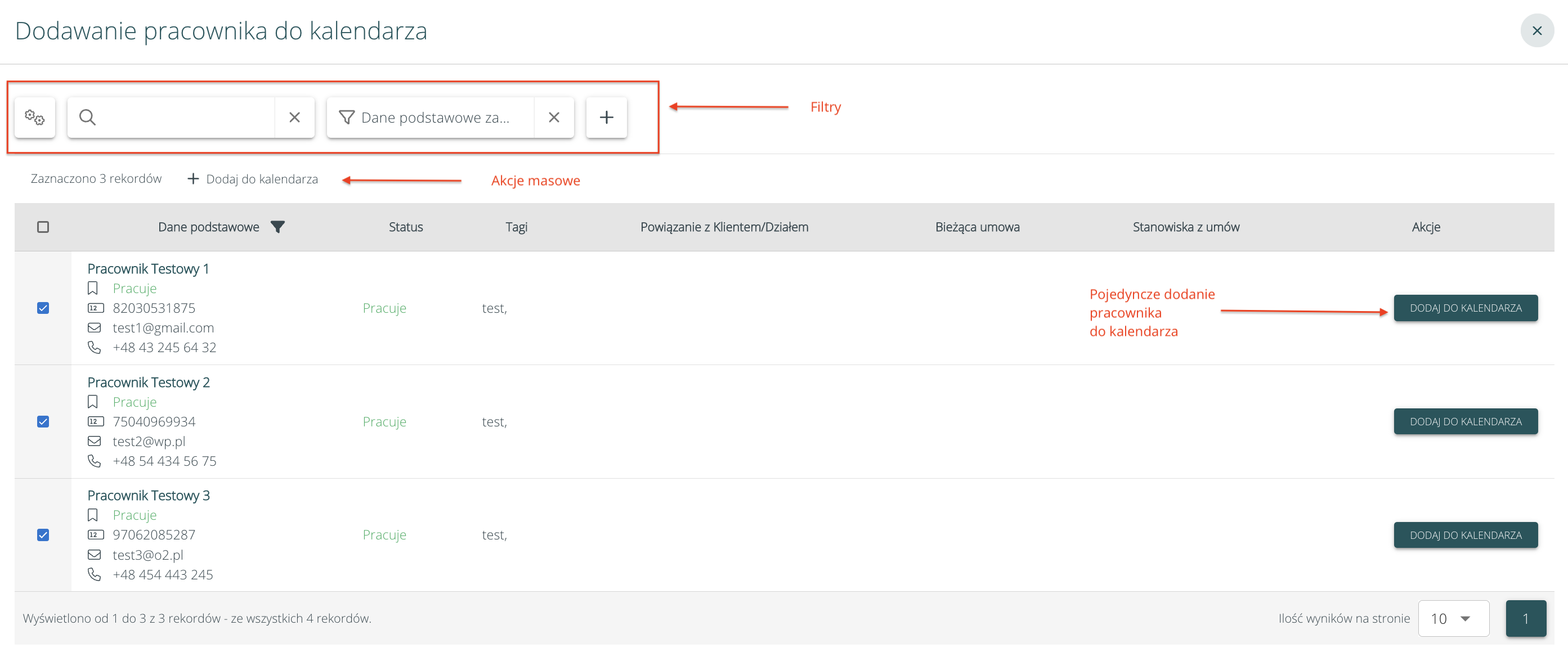 Po kliknięciu pojawi się lista pracowników, których możemy dodać do kalendarza. Korzystając z filtrów nad listą możemy wyfiltrować pracowników. Możemy zaznaczyć pracowników checkboxem i dodać ich masowo do kalendarza korzystając z przycisku nad listą „+ Dodaj do kalendarza" lub możemy dodać każdego pracownika pojedynczo korzystając z akcji „Dodaj do kalendarza" dostępnej w wierszu pracownika:
