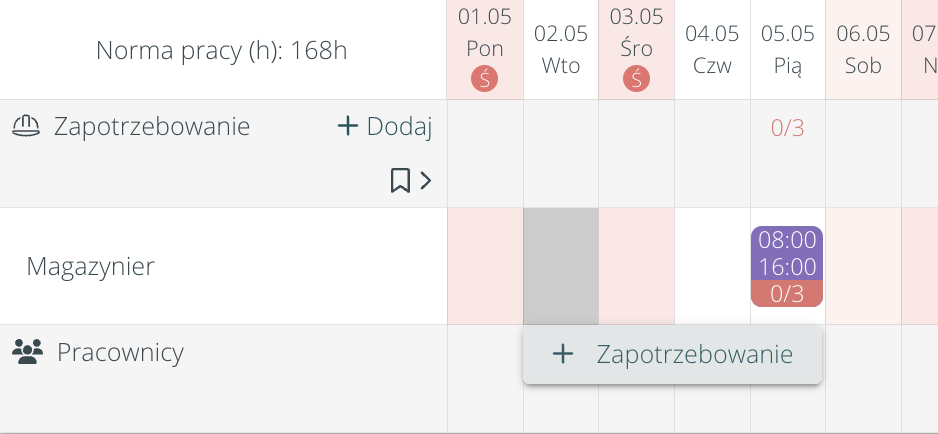 Zapotrzebowanie pozwoli Ci określić ilu pracowników, na jakie stanowiska i w jakich godzinach potrzebujesz każdego dnia.