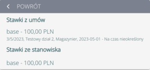 Po wybraniu zapotrzebowania należy wybrać stawkę. Dostępne będą stawki z umowy z pracownikiem, stawki ze stanowiska oraz stawki indywidualne pracownika. Więcej o stawkach indywidualnych dowiesz się tutaj. Dzięki temu pracownik może mieć inne stawki w zależności od stanowiska, czy projektu.
