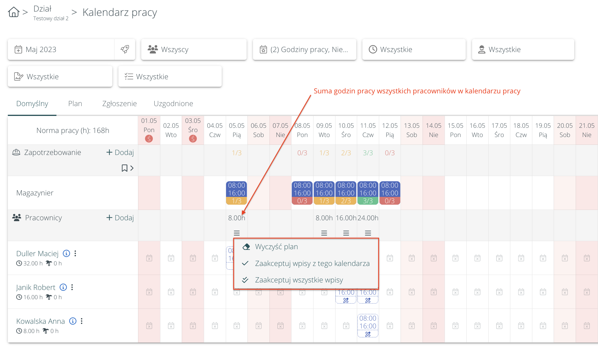 - Zaakceptuj wpisy z tego kalendarza – akceptują cały plan pracy pracowników tego dnia w obecnym kalendarzu