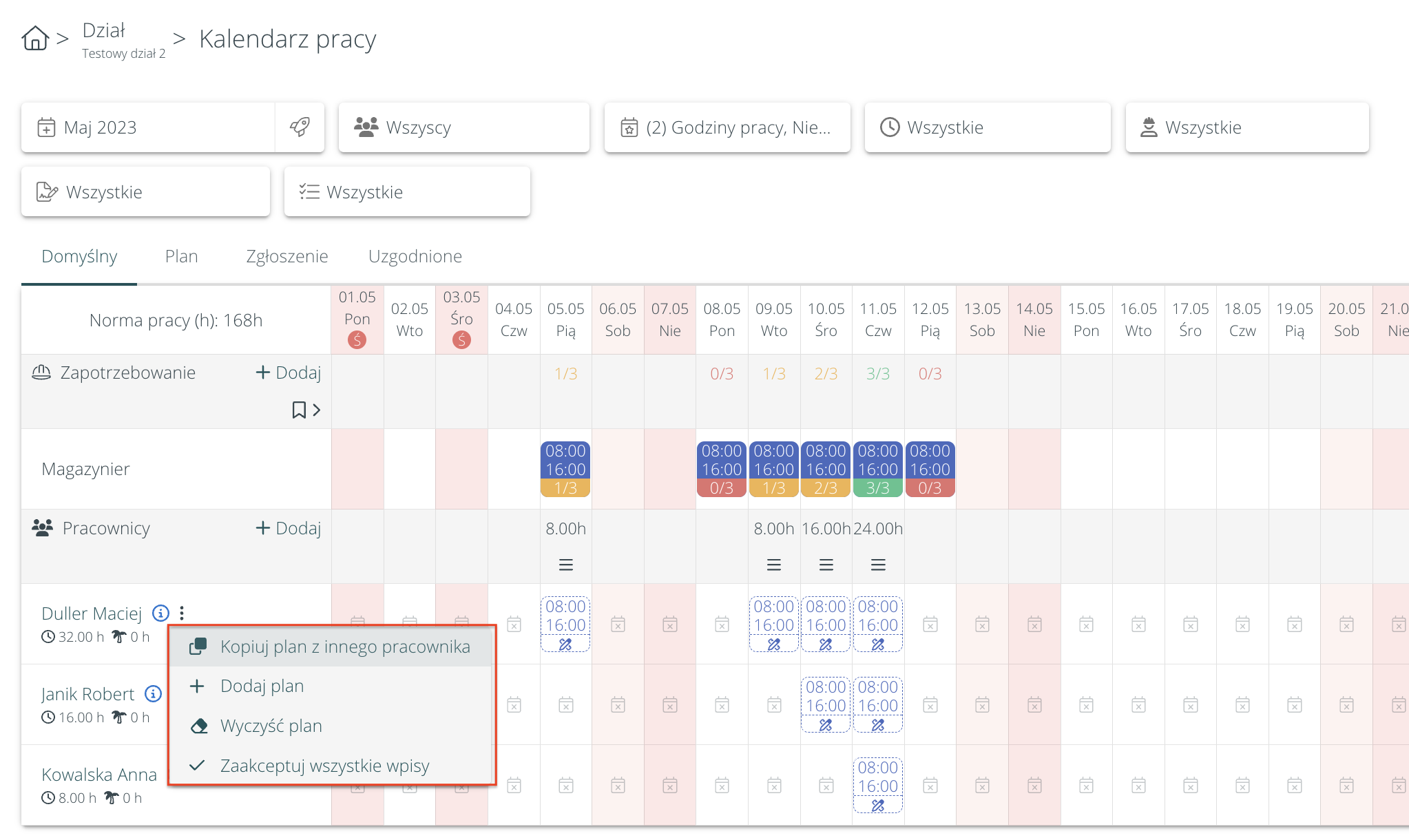 - Kopiuj plan z innego pracownika pozwala zduplikować plan z jednego pracownika do drugiego.