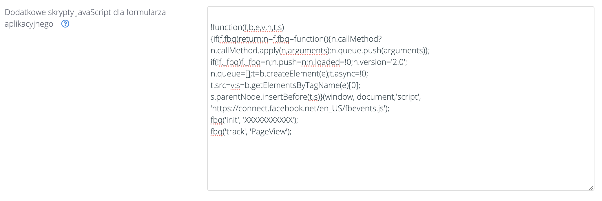 - Jeżeli wklejamy skrypt w ustawieniach firmy , to znaczniki script usuną się same. Jeżeli wklejamy skrypt w ustawieniach konkretnej rekrutacji – skrypt należy wstawić usuwając znaczniki < script > < /script > znaczniki ręcznie. Przykładowy skrypt z Pixelem Meta, po zapisaniu powinien wyglądać następująco: