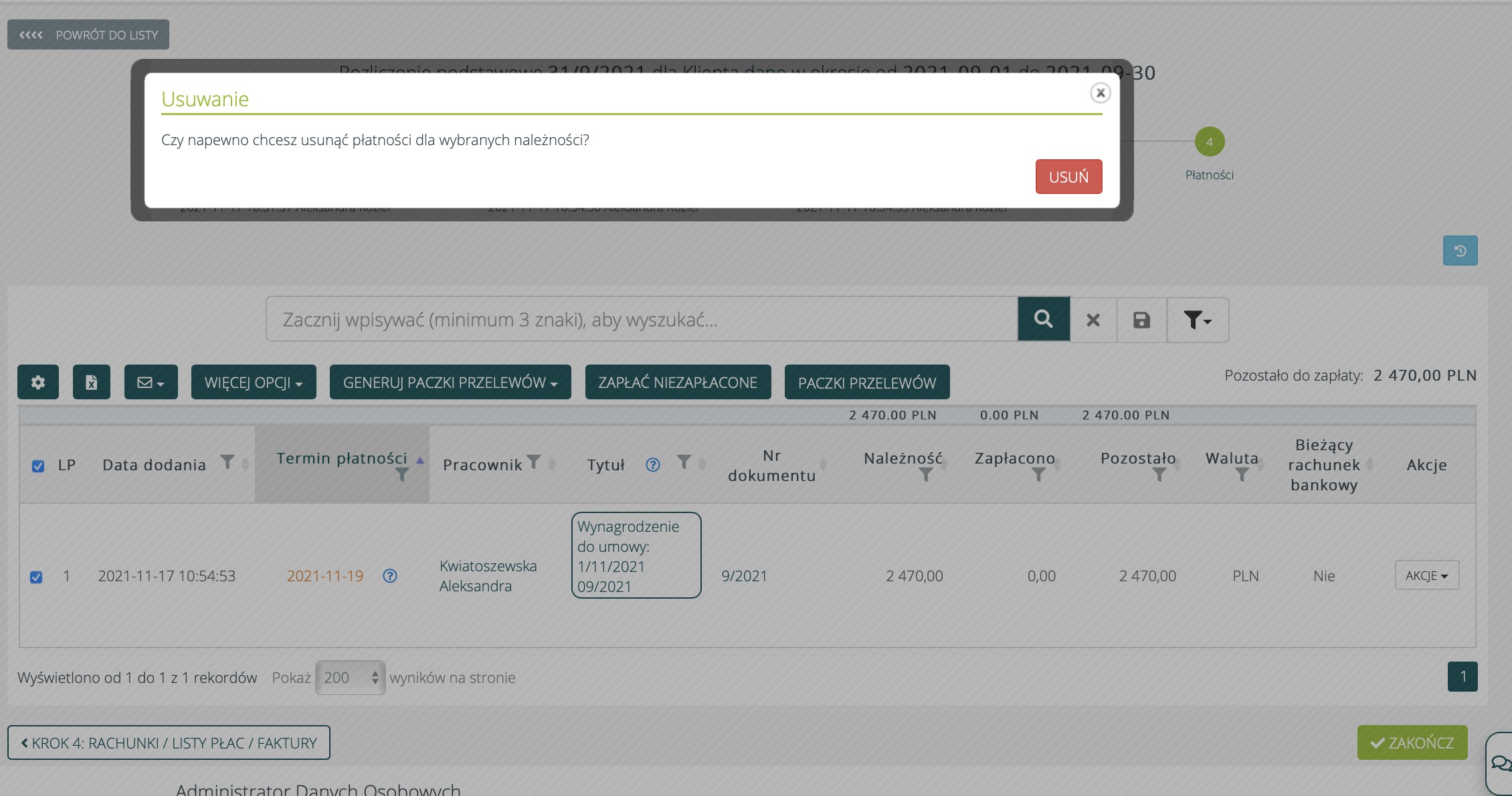 przejść do sekcji Rozliczenia > Dashboard rozliczeń, wybrany miesiąc np. listopad, wybrany Klient, rozliczenie pracowników, wybranie Rachunki/Listy płac, w których jest pracownik.