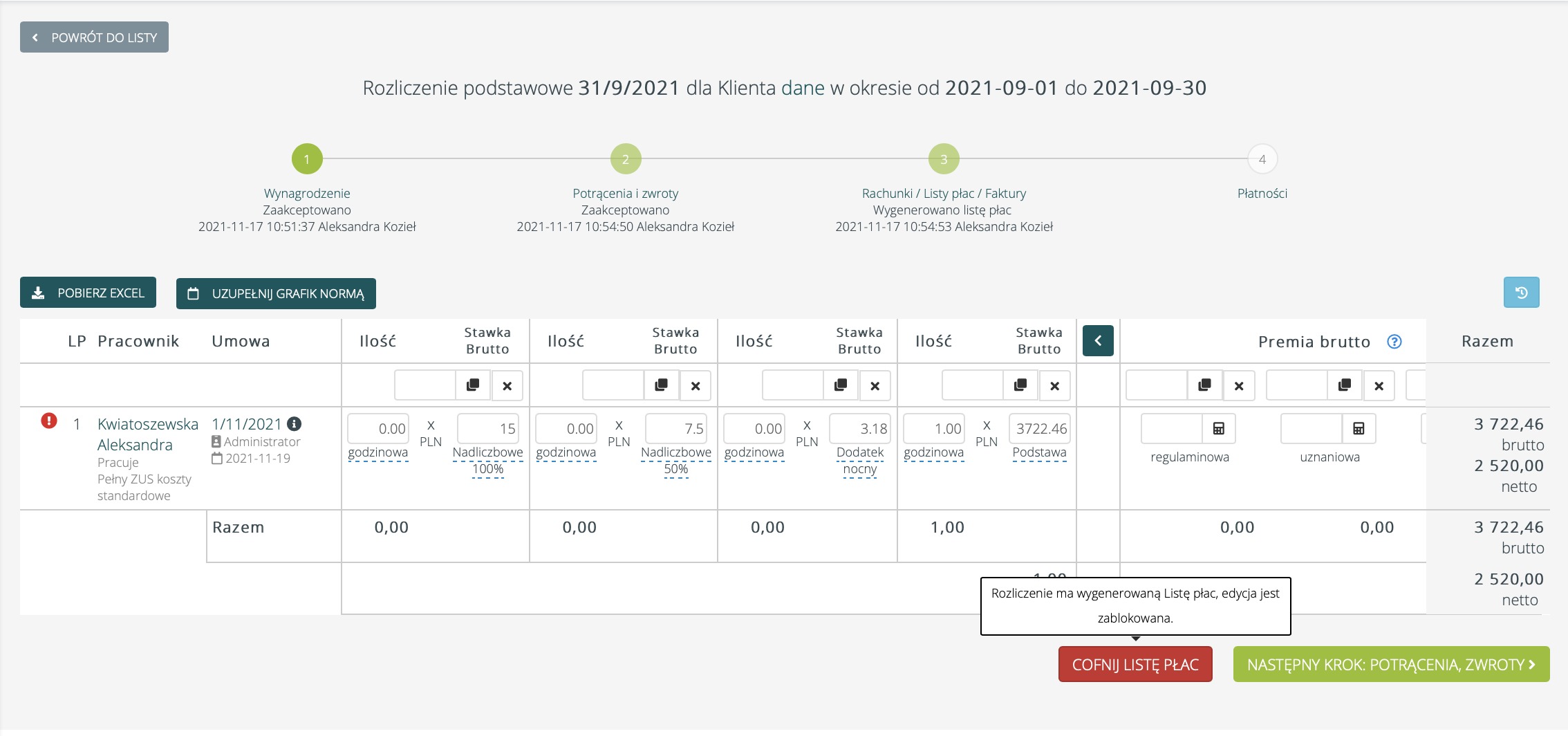 Następnie po przejściu w rozliczenie, należy wycofać Rachunek/Listę płac korzystając z przycisku Cofnij Listę płac.