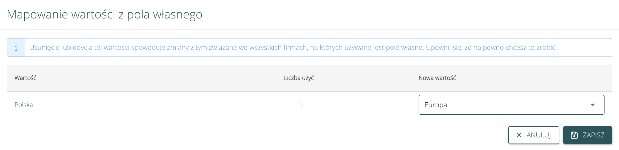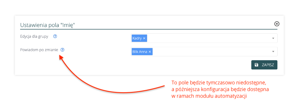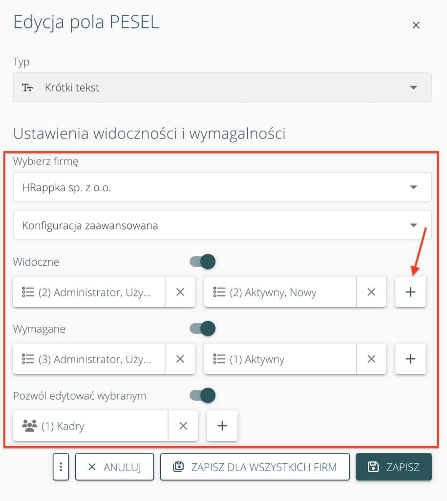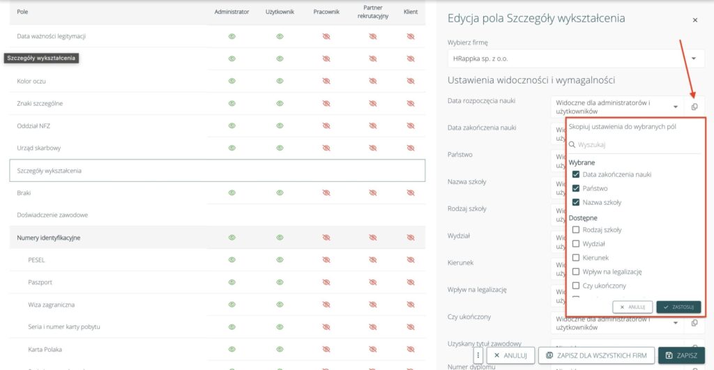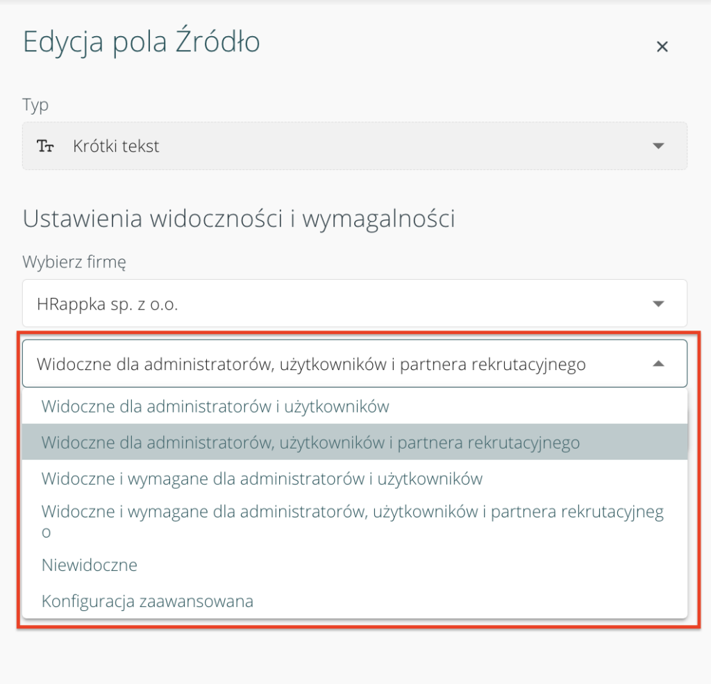 Dodawanie pól do formularza z listy wszystkich dostępnych pól jest dostępne w panelu po prawej. Pola są pogrupowane w sekcje. Dostępne pola można wyszukiwać po nazwie: Sekcja z polami formularza (po lewej) pokazuje pola dodane na formularzu. W zależności od ich widoczności / wymagalności, w kolumnie każdej roli znajduje się ikona informująca o statusie pola. Dostępne ikony: – Pole jest widoczne – Pole jest niewidoczne – Pole jest wymagane (nie można zapisać formularza bez uzupełnienia pola) – Widoczność, wymagalność lub edytowalność pola jest zależna od innych czynników np. różni się w zależności od firmy, grupy, czy statusu. Po najechaniu na ikonę pojawią się szczegóły konfiguracji. Umożliwia wybór i weryfikację pól widocznych dla różnych spółek w systemie. Wcześniej wymagało to przeklikiwania się przez każdą firmę oddzielnie, teraz daje szybki podgląd: Konfigurowalne presety z najczęściej używanymi konfiguracjami widoczności pól, np. widoczne dla administratorów, użytkowników i pracowników, pozwalają sprawnie zdefiniować najczęstsze uprawnienia: Wybór opcji „Konfiguracja zaawansowana" pozwala na konfigurację widoczności i wymagalności pól w zależności od roli, statusu pracownika lub grupy. Można także ustawić, która grupa może edytować dane pole. Aby skonfigurować opcję należy kliknąć w przycisk z ikoną plusa, a następnie wybrać opcję: Aktualnie, ustawienia widoczności i wymagalności pól na formularzu pracownika działają w oparciu o dwie różne logiki: W przyszłości, po nadchodzącej aktualizacji formularza pracownika, użytkownicy zyskają pełną kontrolę nad logiką filtrów. Będzie można samodzielnie wybrać, czy warunki mają być łączone operatorem „i" (wszystkie muszą być spełnione) czy „lub" (wystarczy spełnienie jednego). Po włączeniu po prawej stronie pól złożonych, które zawierają w sobie inne pola, należy zdefiniować widoczność każdego z pól: Korzystając z ikonki kopiowania przy wybranym polu pola złożonego, możemy sprawnie przenieść jego konfiguracje widoczności / wymagalności na pozostałe pola: W przypadku dodawania pola własnego o typie „Plik" lub „Wiele plików", istnieje możliwość wybrania kategorii pliku. Dzięki temu, dodawane w tym polu pliki automatycznie otrzymają wybraną kategorię, która będzie widoczna w załącznikach na profilu obiektu: Przykład zastosowania: Na ankiecie aplikacyjnej, możemy dodać pole własne o typie plik i nazwie CV. Gdy wybierzemy kategorię CV to plik automatycznie wskoczy do profilu pracownika z odpowiednią kategorią. Dodawanie sekcji i tekstu do formularza, pozwala na jego podział i wyróżnienie ważnych informacji. Dla spójności terminologicznej wprowadzamy zmianę nazewnictwa atrybutów na pola własne. Umożliwiliśmy mapowanie odpowiedzi w przypadku edycji wartości w polach własnych, nawet jeśli pracownicy mają już zaznaczone odpowiedzi. Po edycji odpowiedzi z pola własnego, system pokaże okno z wyborem nowej wartości dla zmienionej odpowiedzi: Mapowanie jest dostępne w przypadku pól własnych o typie: Mapowanie działa wielofirmowo. Usprawniliśmy automatyczne tłumaczenie zarówno wszystkich pól własnych jak i ich wartości: Aby uprawnić tłumaczenie, z filtra nad listą można wybrać języki, których tłumaczenie chcemy zweryfikować: Historia pozwala na śledzenie zmian w czasie. Dostępna jest nad listą pól formularzy: Na pewien czas zostanie wyłączona możliwość samodzielnej konfiguracji powiadomień o zmianie danych pracowników i kandydatów, które konfigurowane są teraz w Ustawieniach > Formularze > Pracownicy / Kandydaci, podczas edycji wybranych pól: Zapewniamy, że konfiguracja obecna podczas wdrożenia zostanie zachowana i powiadomienia będą poprawnie wysyłane, jednak zmiana tej konfiguracji nie będzie przez najbliższy czas dostępna w systemie. Zachęcamy Państwa do sprawdzenia poprawności obecnych ustawień tych powiadomień przed datą wdrożenia. Po aktualizacji systemu, wszelkie zmiany w tej konfiguracji będą możliwe jedynie poprzez kontakt z naszym Działem Wsparcia. Tymczasowe ograniczenie jest związane z trwającymi pracami nad przebudową formularzy i modułem automatyzacji.