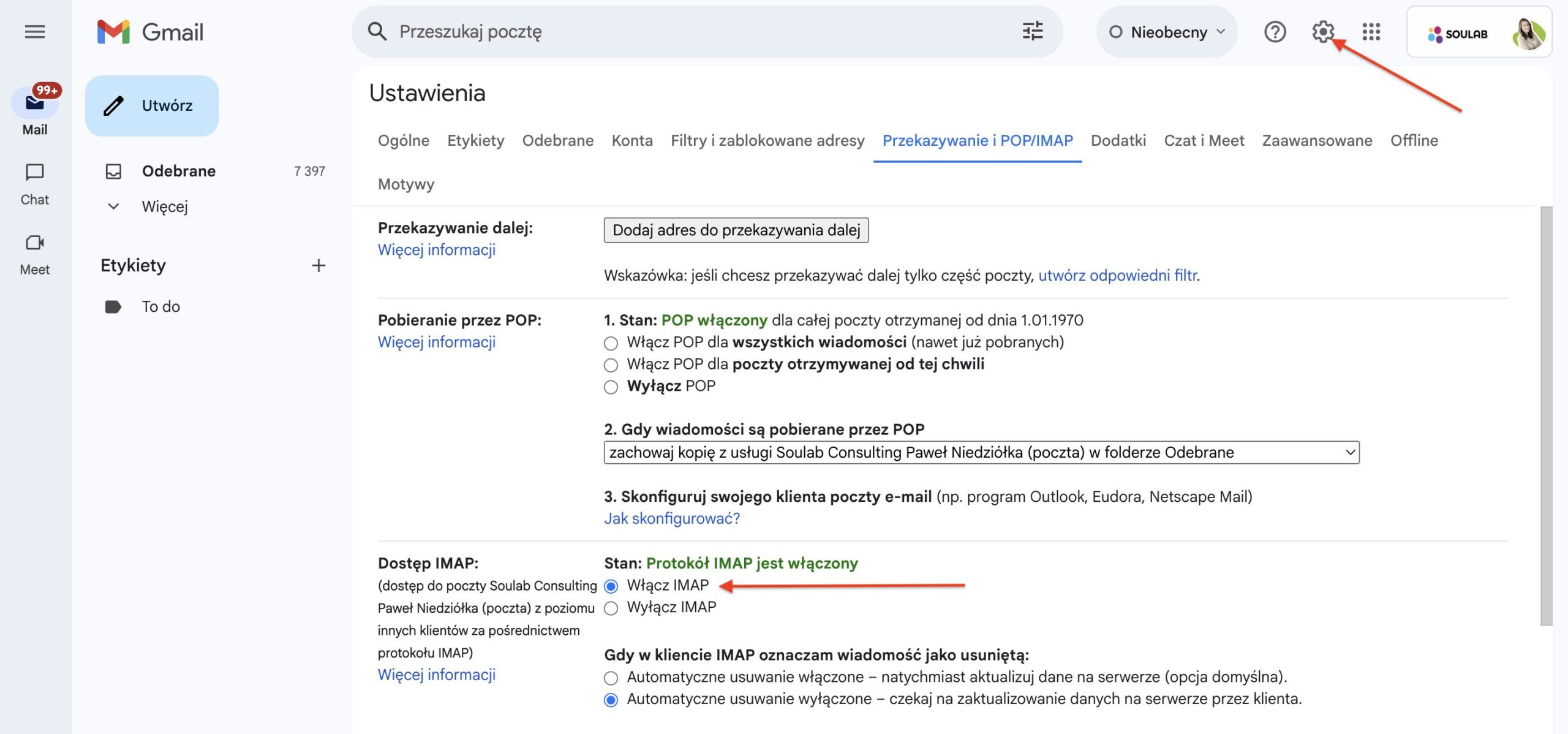 - Aby móc parsować skrzynkę email, w Ustawienia > Zobacz wszystkie ustawienia > Przekazywanie i POP/IMAP > Włącz IMAP > Zapisz zmiany