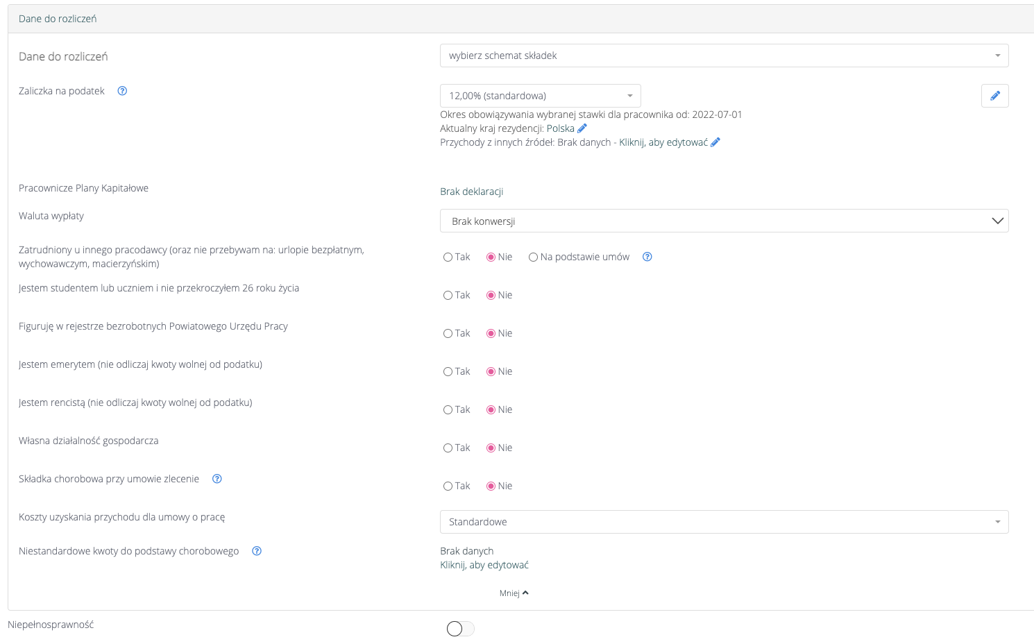 Aby skonfigurować/zmienić ustawienia kadrowe pracownika należy wejść profil pracownika > Dane > Dane rozliczeń.