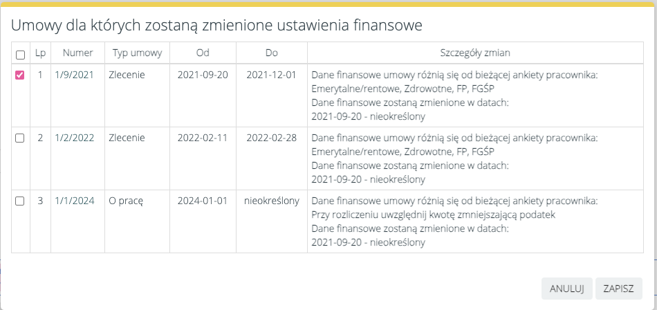 Po zapisaniu system wyświetli okno z umowami, dla których możemy zastosować zmienione ustawienia finansowe: