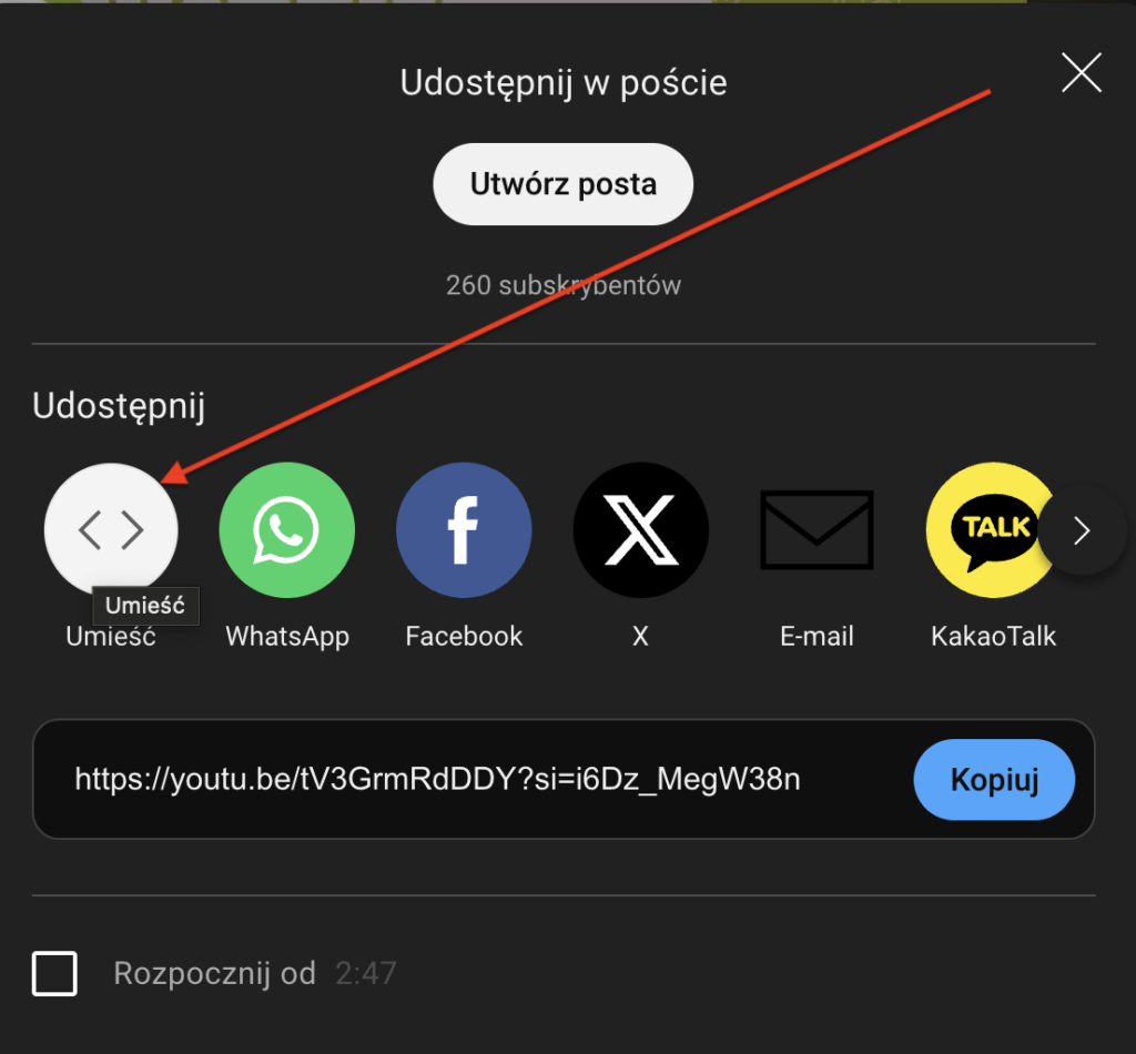 Dla przykładu, na Youtube należy kliknąć Udostępnij (pod filmem).