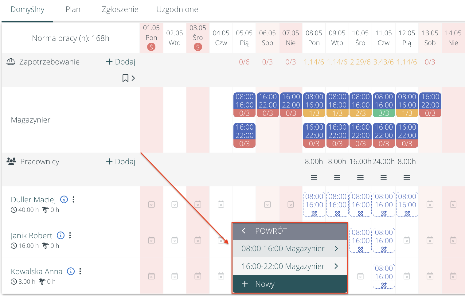 Aby zaplanować pracownika na kalendarzu pracy, który pracuje na różne zmiany w ciągu całego miesiąca należy na kalendarzu zaznaczyć daty, w których pracownik ma pracować, wybrać „+ Plan".