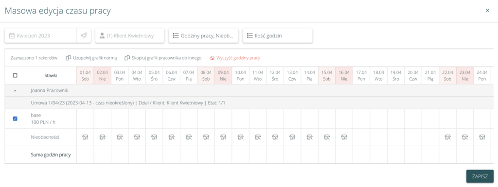 Akcje masowe zostały przeniesione nad tabelę i umożliwiają uzupełnianie grafiku normą, skopiowanie grafiku pracownika do innego oraz wyczyszczenie godzin pracy.