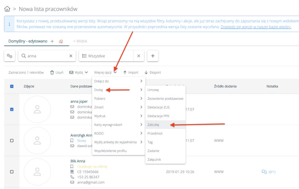 Masowe dodawanie zaliczek dostępne jest z poziomu nowej listy pracowników, po zaznaczeniu wybranych pracowników checkboxem i wybraniu (nad listą) Więcej opcji > Dodaj > Zaliczkę.