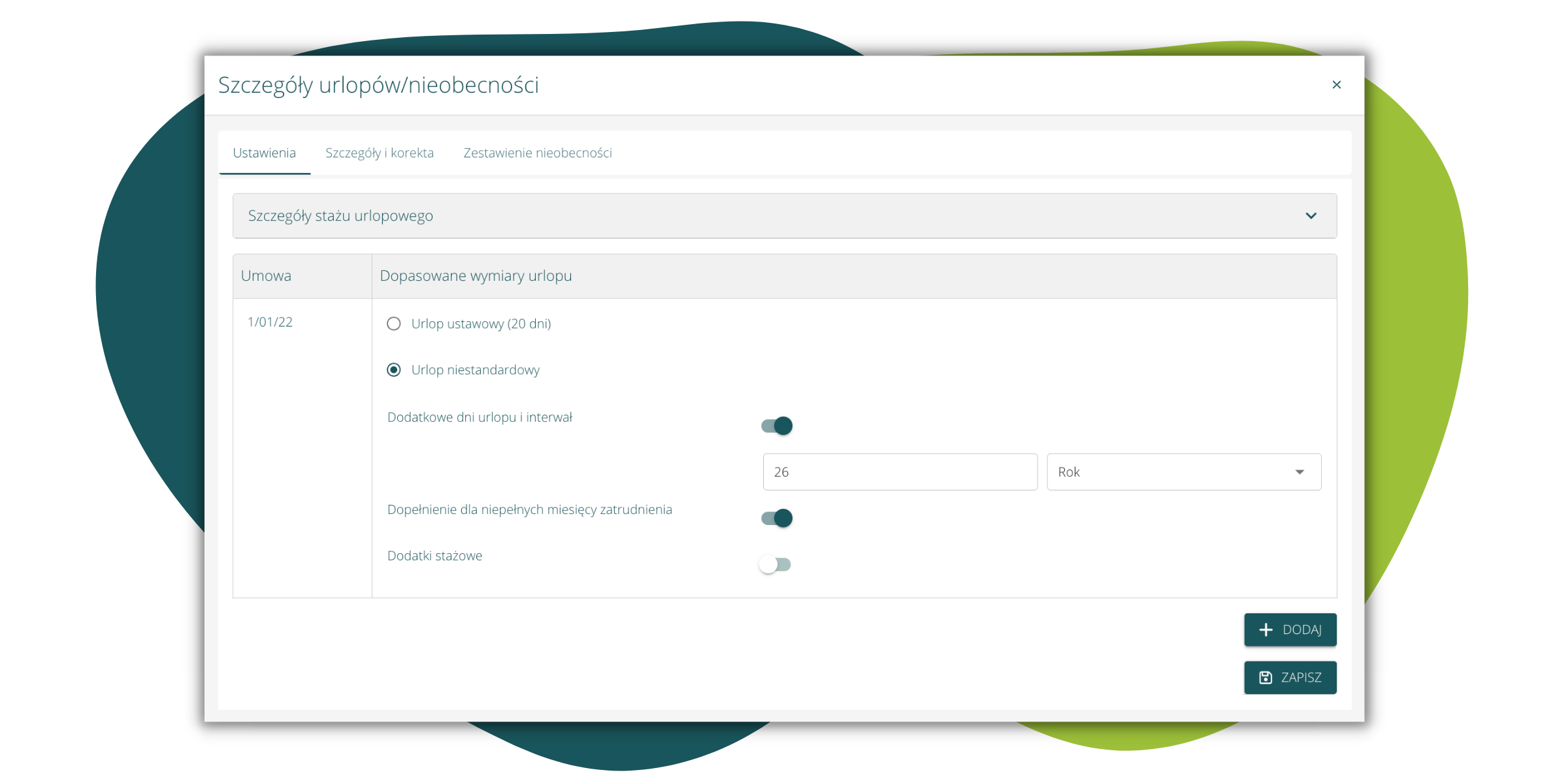 Szczegóły ustawień urlopu #