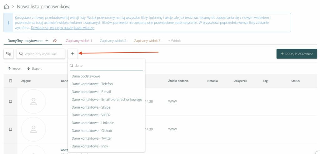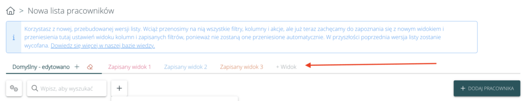 Zapisane filtry i ustawienie widoku kolumn są możliwe do zapisywania w formie widoków. Ustawienia widoku kolumn i zapisane filtry ze starych list, nie zostaną automatycznie przeniesione na nowe listy. Należy je przenieść samodzielnie.