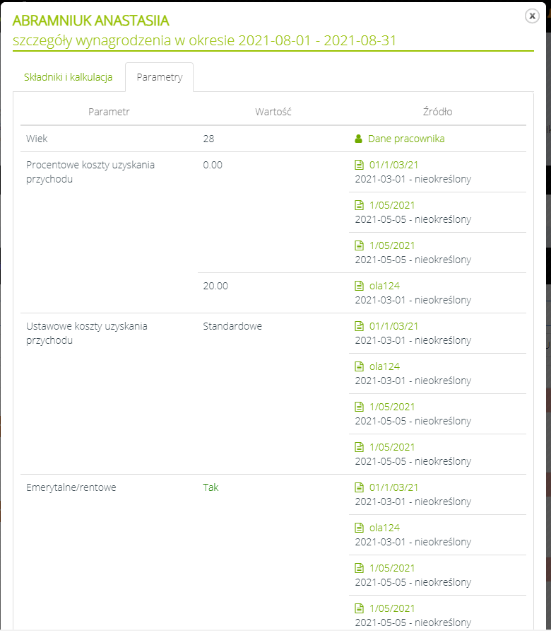 Na grafiku wybranego pracownika w szczegółach godzin (sekcja Godziny, przycisk Szczegóły) została dodana zakładka Parametry, która pokazuje parametry uwzględnione podczas wyliczania wynagrodzenia pracownika (np. Emerytalne, Chorobowe, Zdrowotne). Istnieje również możliwość sprawdzenia źródła przypisanego do danego parametru (np. z ustawień firmy, Umowy, czy Klienta).