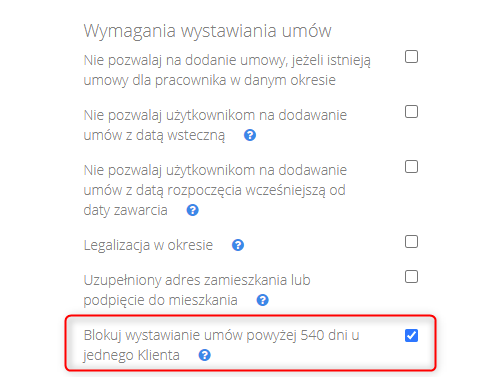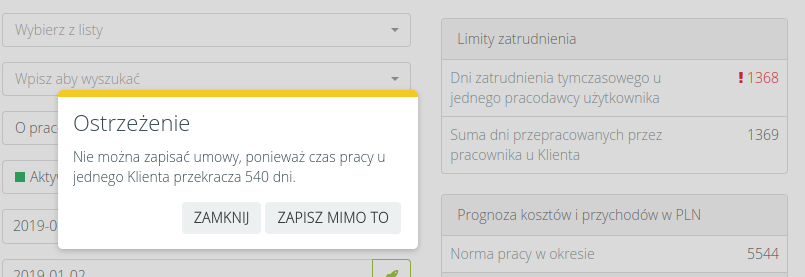 Agencje pracy: Blokowanie wystawiania umów powyżej 540 dni u jednego Klienta #