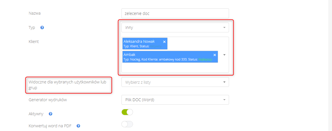 Możliwość ograniczenia dostępności wydruku o typie Inny dla wybranego Klienta #