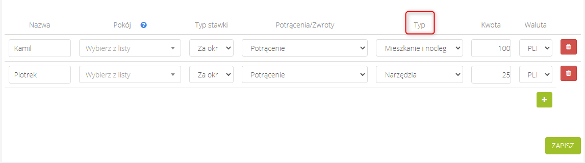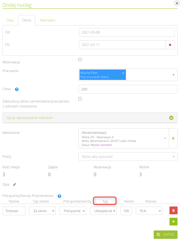 Możliwość wyboru Typu potrącenia przy dodawaniu noclegu na wybranym pracowniku #