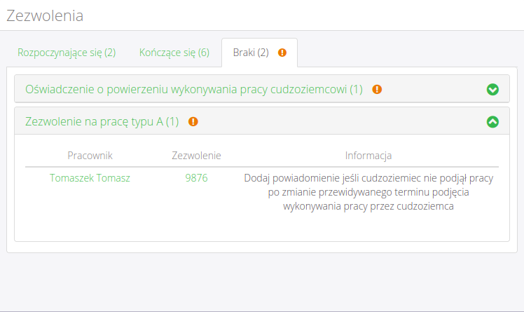Jeżeli w przewidywanym terminie cudzoziemiec nie podjął pracy to na dashboardzie w widgecie zezwoleń w zakładce “Braki” pojawi się informacja o tym.