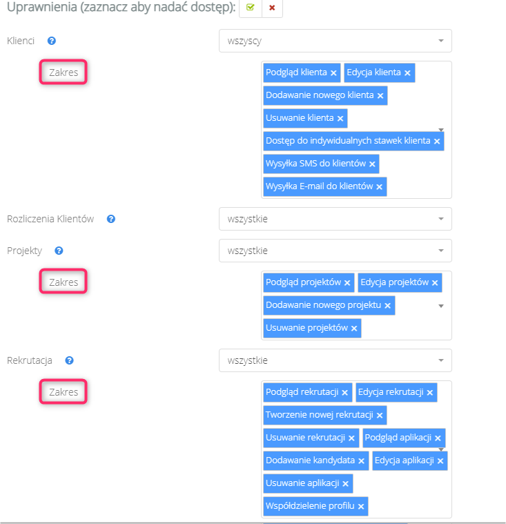 W Ustawienia > Główna > Użytkownicy podczas dodawania/edycji użytkowników, do poszczególnych uprawnień (m.in. do Klientów, Pracowników, Rekrutacji), zostało dodane pole “Zakres”, które pozwala jeszcze dokładniej konfigurować uprawnienia Użytkowników do wybranych modułów (m.in. podglądu, edycji, dodawania, czy usuwania encji).