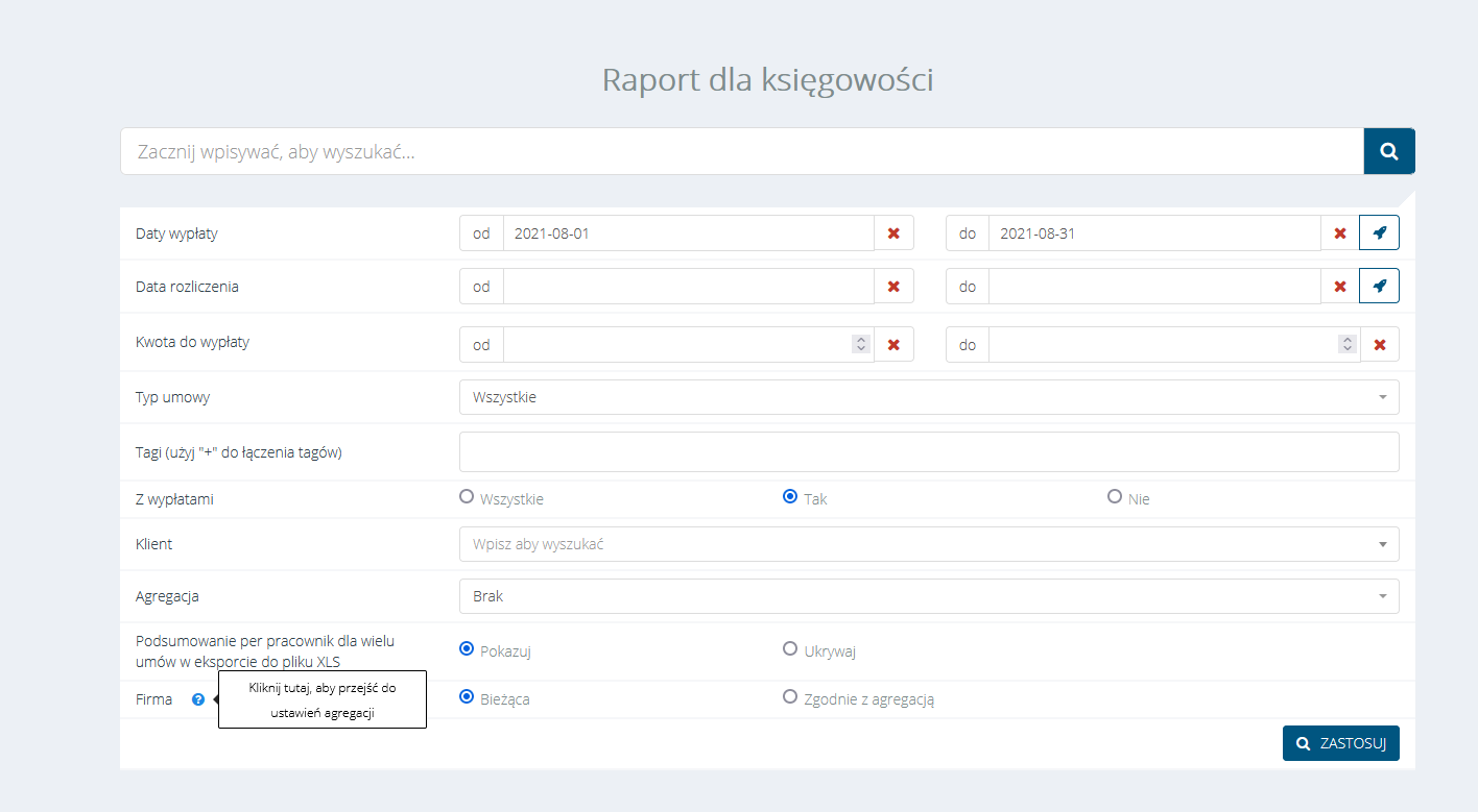 W raporcie dla księgowości został dodany filtr Firma z możliwością wyboru Bieżąca i Zgodnie z agregacją. Pozwala to na sprecyzowanie, z jakich firm lub firmy będzie wyświetlany raport.