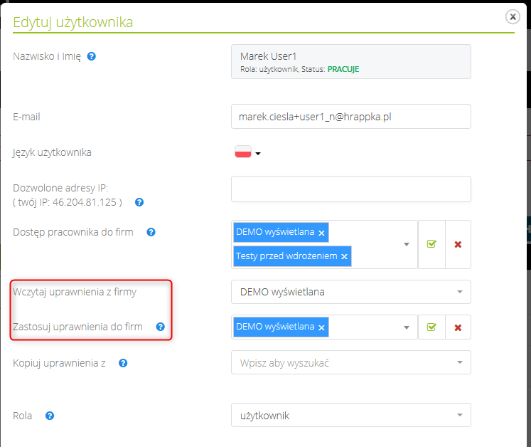 Zostały dodane również opcje przypisania i wczytywania uprawnień firmy/firm do konkretnych użytkowników: