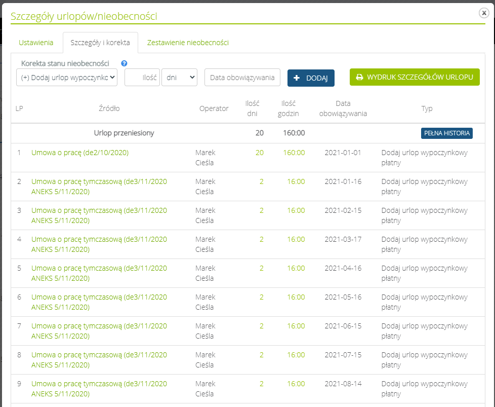 Na profilu pracownika, w zakładce Grafik w szczegółach nieobecności (sekcja Nieobecności, przycisk Szczegóły i korekta) został dodany typ i numer umowy do kolumny Źródło.