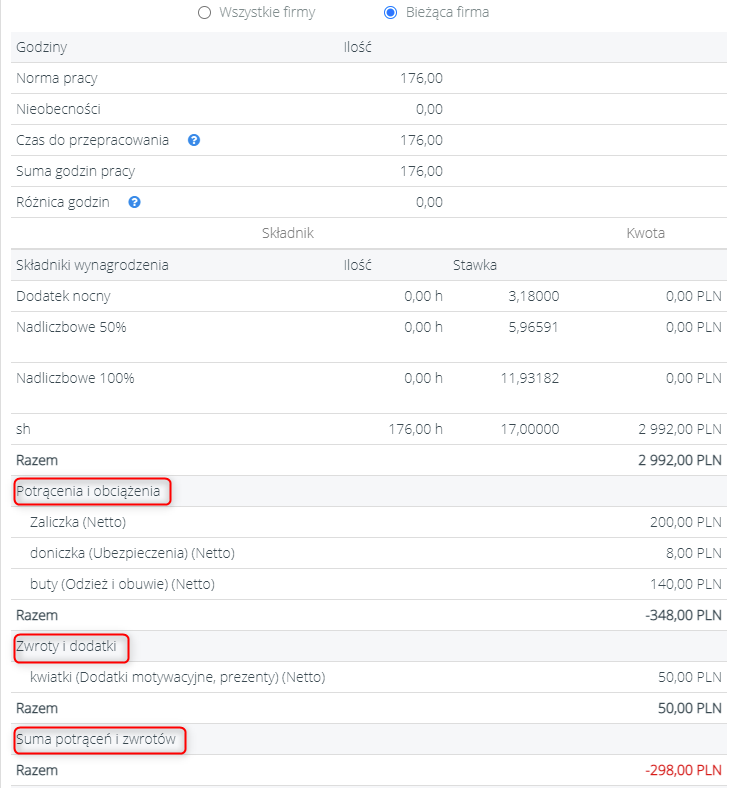 Nowe kolumny w raporcie wynagrodzeń i potrąceń pracownika według rozliczeń w okresie #