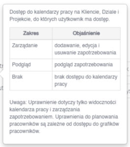 Do systemu dodane zostało nowe uprawnienie dla roli użytkownik – „Zapotrzebowanie na kalendarzach pracy”. Do tej pory uprawnienie do kalendarzy pracy powiązane było z uprawnieniami do projektów. Obecnie zostało wydzielone i jego edycja możliwa jest w Ustawienia > Użytkownicy > Dany użytkownik > Zapotrzebowanie na kalendarzach pracy.