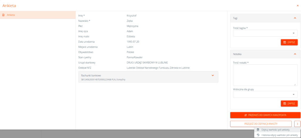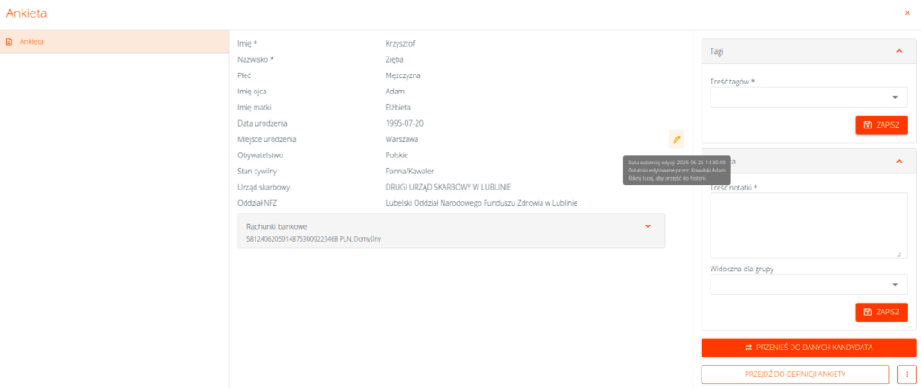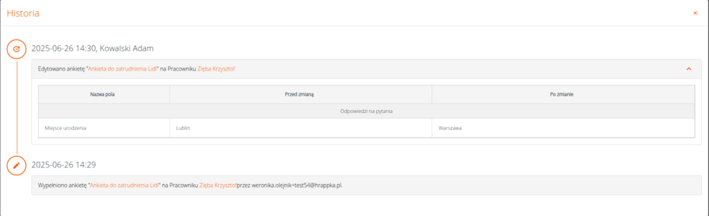 Dodatkowo obok każdego zmodyfikowanego pola zostanie wyświetlona ikona ołówka, a po jej kliknięciu system wyświetli historię zmian wprowadzonych na ankiecie.