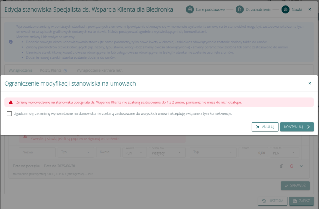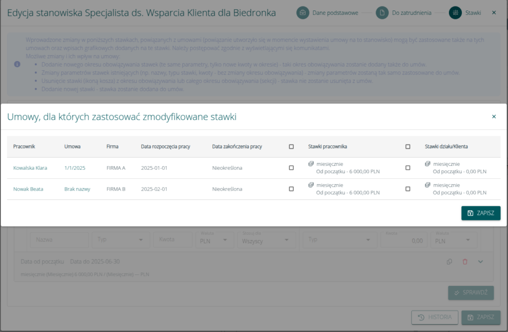 Po wdrożeniu zmian system będzie umożliwiał zbiorczą aktualizację stawki uwzględniając wszystkie umowy powiązane z danym stanowiskiem, niezależnie od firmy na której zostały wystawione.