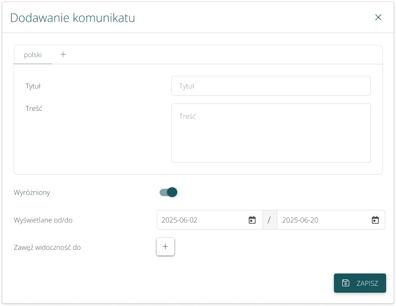 - Komunikaty – administratorzy mogą publikować komunikaty widoczne po zalogowaniu się pracownika.