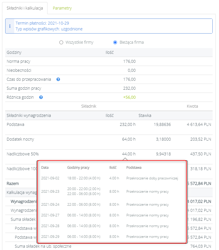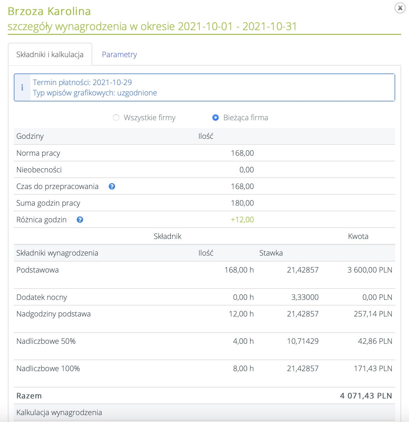 Na grafiku wybranego pracownika w szczegółach godzin (sekcja Godziny, przycisk Szczegóły) w sekcji “Kalkulacja wynagrodzenia” zostały dodane dwa nowe wiersze: