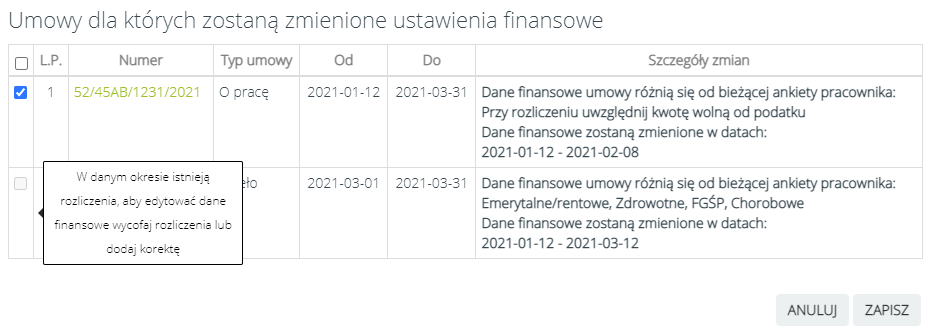 Po zmianie daty w polu “Data, od której zastosować nowe ustawienia finansowe” i zapisaniu ustawień, wyświetli się okno z wszystkimi umowami pracownika, w których pojawią się zmiany (ze szczegółami jakie zmiany i możliwością decyzji, czy je wprowadzić). Dla umów rozliczonych nie będzie możliwe wprowadzenie zmian i system pokaże odpowiedni komunikat.