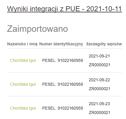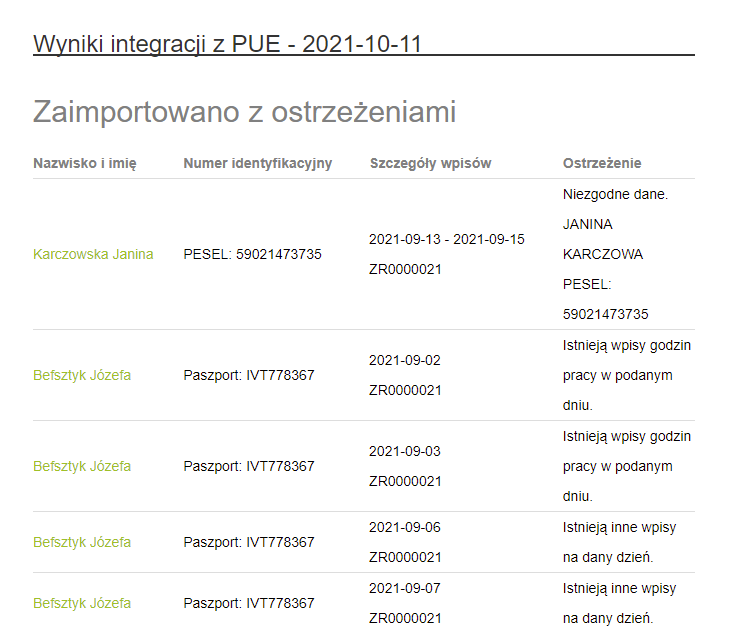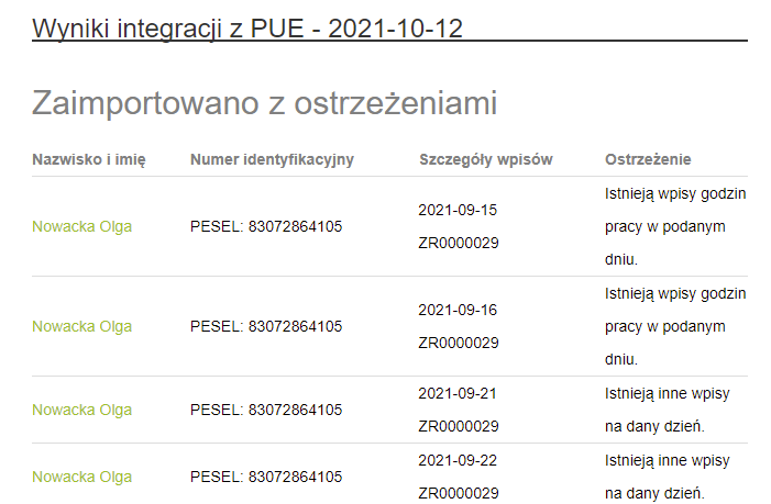 Zaimportowano z ostrzeżeniami – w tej sekcji znajdują się informacje o pracownikach, którym zaimportowano wpisy chorobowego, ale system napotkał pewne nieścisłości: